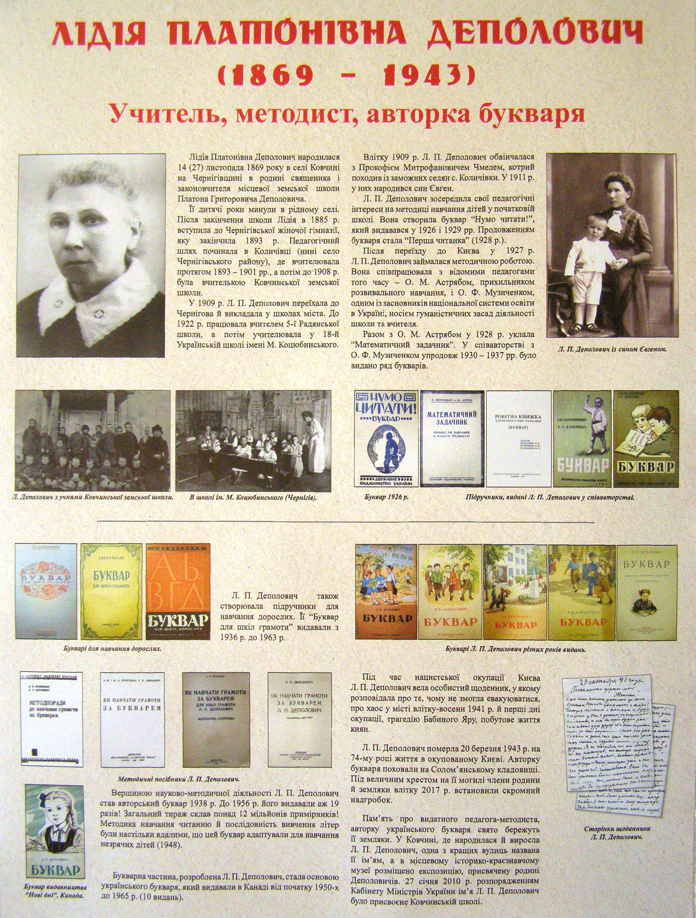 У книзі висвітлено життєвий шлях і педагогічну діяльність учителя і методиста початкової освіти, авторки букварів Лідії Платонівни Деполович. Наведені документи та щоденникові записи розкривають сутність світогляду Л. П. Деполович та її ставлення до сучасності. Видання містить усі відомі на сьогодні фотографії Л. П. Деполович.